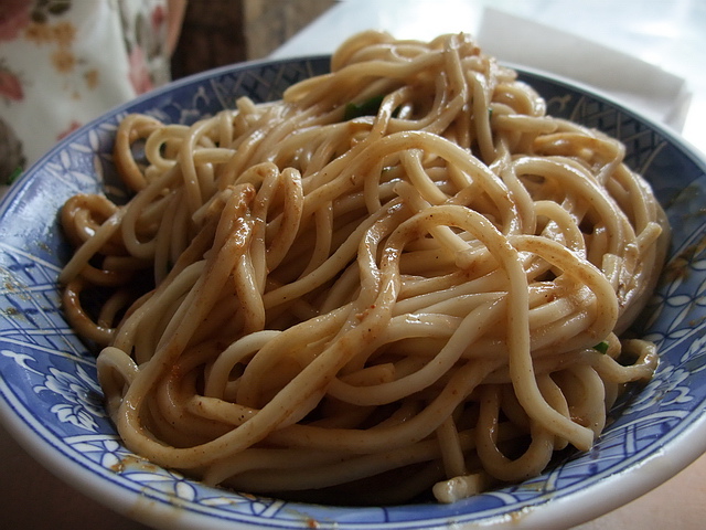 乾麵(小):雖然小碗份量已飽肚有餘,但$40的價格,不禁讓人覺得有些貴吧!比較慶幸地,那麻醬味道,依舊好味,讓初訪的魔女也覺得好吃~葉子也滿足哩。說真得,乾麵看似簡單,但要達到麵條、肉燥、麻醬合一的境界,還真得不多,至少老黃的乾麵,讓葉子覺得有到位,入口香順,又不讓人覺得油膩。