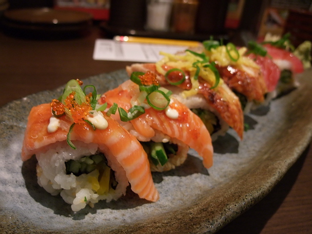 特上綜合壽司:屬於創意壽司的型態,有三種魚款(鮭魚、鰻魚、鮪魚),各兩貫。簡單形容,好似吃花壽司的fu,說不上好吃,也不至於雷啦。BTW,若對魚生有莫名想吃的衝動,葉子頗建議,直接點份刺身比較好