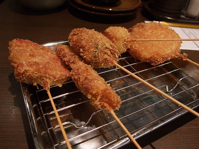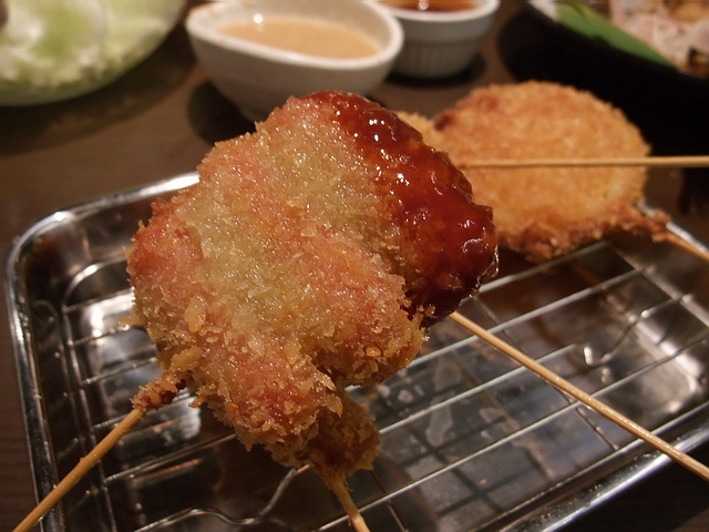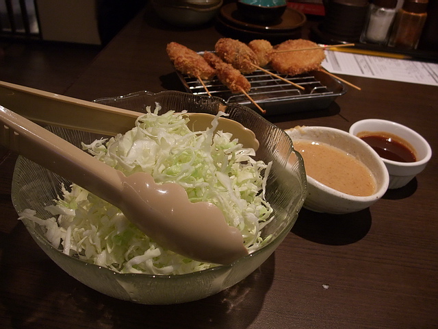 特選綜合串揚:新款季節菜,明知冒險,但還是入雷山。除了五串炸物外,還附贈有機高麗菜,炸物分別有(洋蔥、培根鵪鶉蛋、海苔蟹柳、豬肉、香腸)。至於哪一串好味?葉子&魔女還真得選不出,因為,附贈的有機高麗菜,比較好吃哩