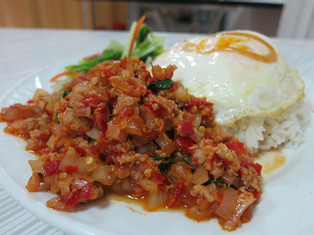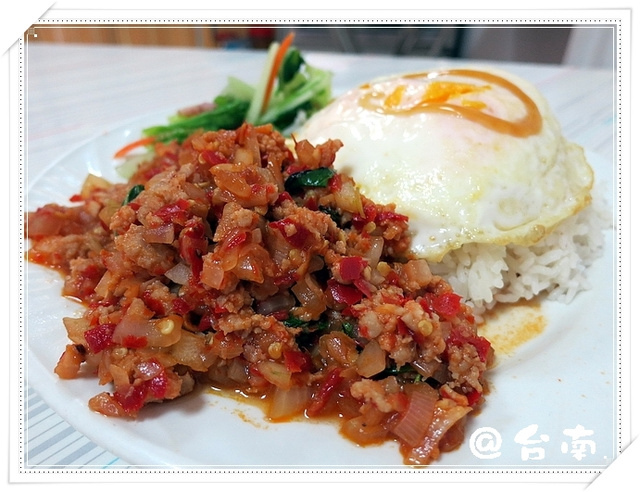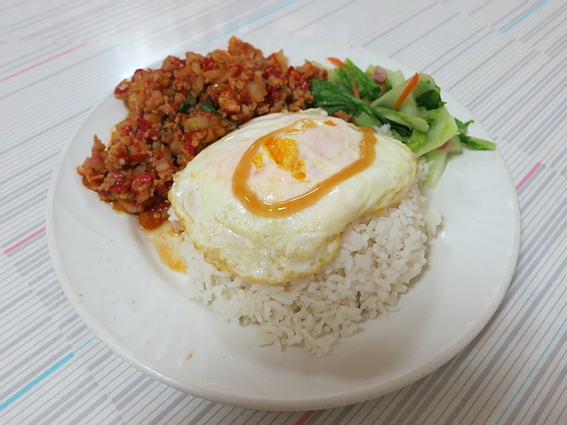 打拋豬肉飯:除了跟米飯一樣多的主角 打拋豬肉外,還有青菜、荷包蛋,光視覺上,葉子就覺得值得。回歸主角身上,香氣鹹度都夠,唯獨辣度,稍微淡了些(還是葉子都吃比較辣@@a),若再辣些,會更爽快!