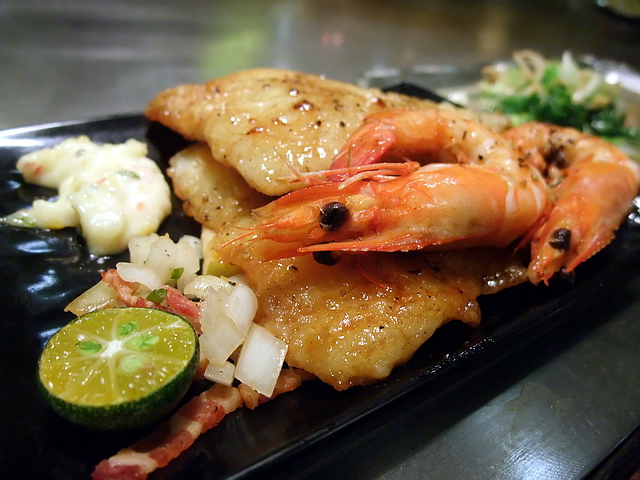 鐵板鱈魚、香煎鮮蝦:少許胡椒調味上桌的兩品海鮮料理,除了小蝦不甚喜歡外,那乾煎鱈魚,可讓葉子喜歡的很(魔女:你本來就愛吃鱈魚咩),旁邊的酸甜醬料,就隨意吧~但葉子建議單吃就很夠了~