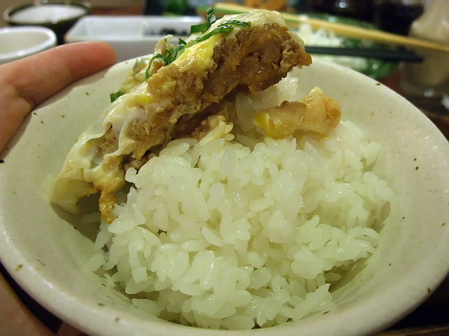 鍋膳‧腰內肉:除了腰內肉,還有里脊可選。豬排淋上半熟蛋、洋蔥醬汁為底,類似丼飯的fu啊!但這款料理的豬排份量不多(60g),若食肉的胃口較大者,可就會比較失望些;再者,除了豬排外,融合蛋汁的醬汁,超下飯的.....