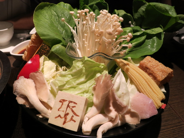 嚴選套餐‧百匯時蔬拼盤:份量十足,有蔬菜、菇類、小玉米、豆皮、豆腐等,光這一份菜盤,也吃得八分飽惹!但蔬菜涮麻辣湯底,就真得太油膩,若兩人來吃,點個鴛鴦鍋,比較好喲