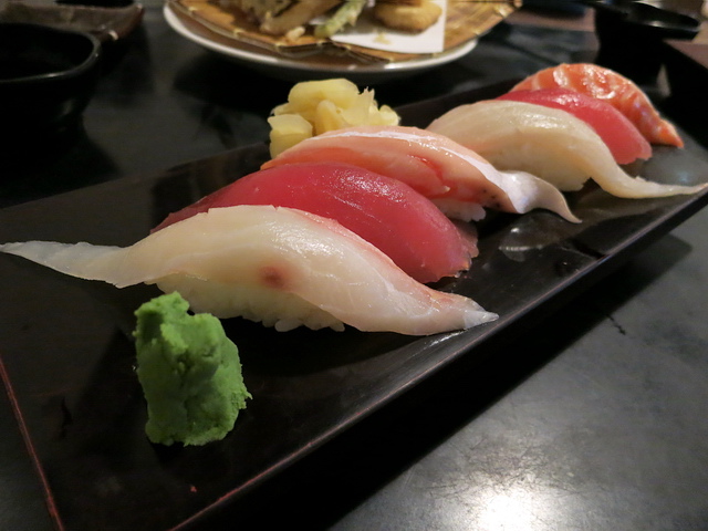 綜合握壽司:魚生部分為常見的海鱺、鮪魚、鮭魚等六貫,鮮度不錯,魚生各頭也頗大,相比於上一道的鮮蝦飯糰,至少蓋住了米飯啦