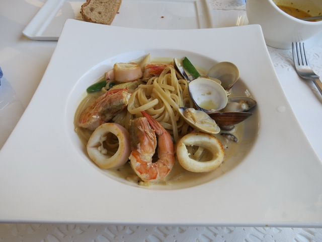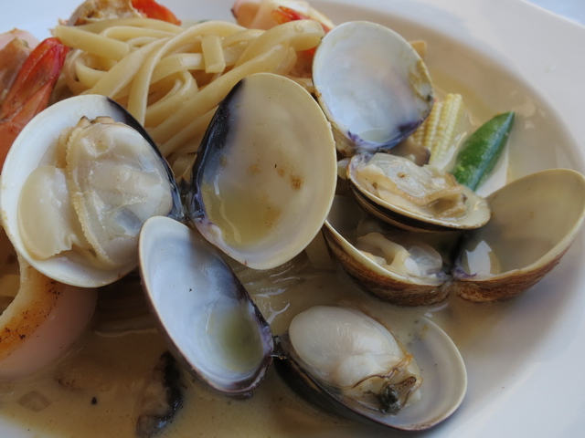 綜合海鮮義大利麵:口味型態可選(紅、白醬)(細扁麵、燉飯),初訪Freeway,葉子嘗試白醬口味的細扁麵。海鮮料部分,有蛤蠣、花枝、鮮蝦、蔬菜等配料,走得基本卻也豐富。白醬部分,不是常見得那種濃稠奶香醬汁,反而是一股散發的層次香味的醬汁,還多了一股清爽而不膩口;麵條為細扁麵,非葉子愛的寬扁麵,但濃郁的醬汁搭寬麵很搭,而Freeway的白醬不走這種風格,所以,細扁麵就顯得很搭!