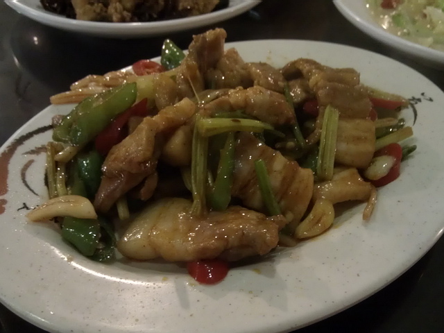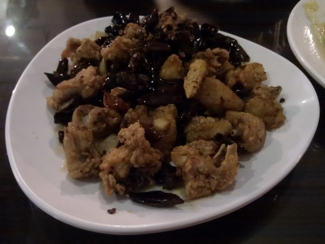 重慶辣子雞:跟想像中不一樣,就是炸過的雞肉和著辣椒,骨頭沒有去,加上切得小塊,很容易被骨頭刺到。建議還是點宮保雞丁比較保險