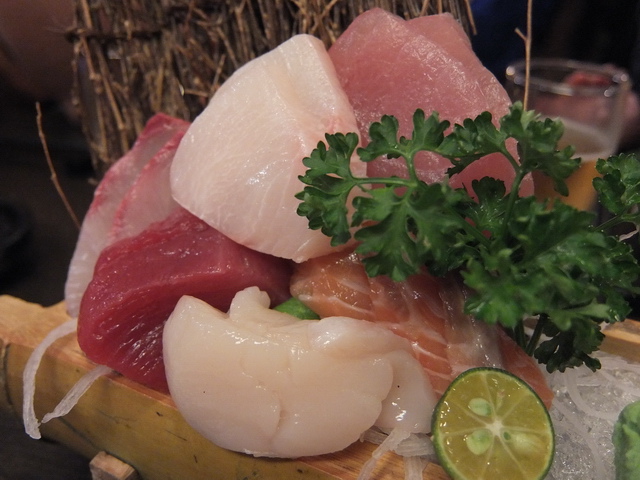 生魚片盛盤:厚度豪邁,又有葉子愛吃的干貝、海鱺,除了芥末非現磨之外,首發的生魚盤,有好的開始!