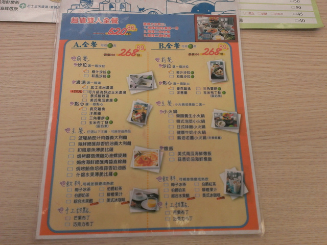 MENU(放大):餐點部分,有焗烤、義大利麵、披薩、燉飯、小火鍋、單品小點等,亦有不同套餐、雙人組合選。除了火鍋外,單品價格都低於100。多年後回訪,點份套餐,再搭個單點主餐吧