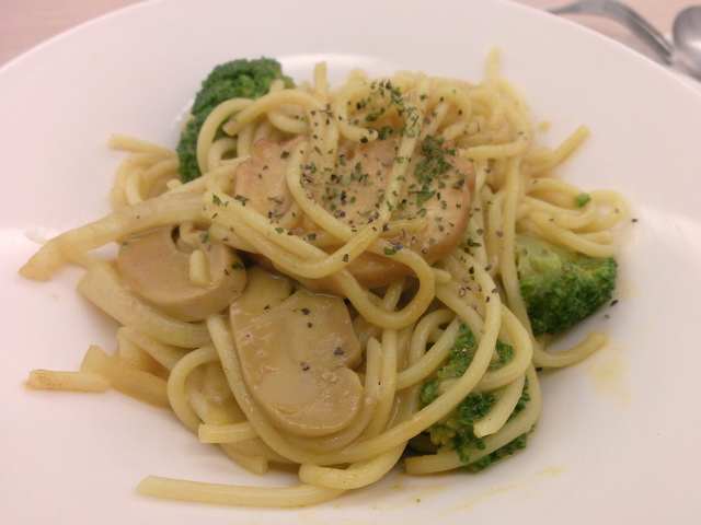蘑菇燻雞義大利麵:記憶中,那澎湃的份量,已不復見,大概捲了幾口,就沒了。至於味道上,說不上好吃,或許跟這幾年吃吃喝喝有關。但對這種學區異料的品質與價格,也不能太多要求啦!