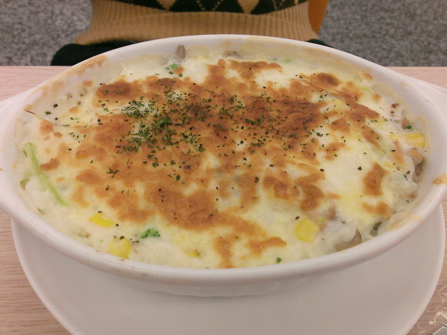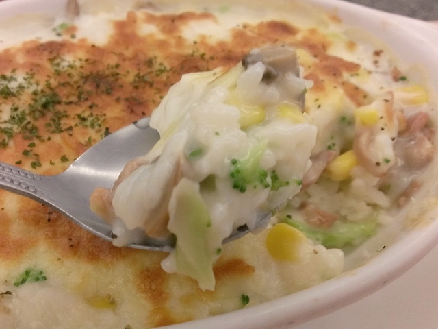 蘑菇燻雞奶油焗烤飯:份量相對比義大利麵多,會比較有飽足感。口味上,依舊不太行,料也一般,最好的,應該是上頭那層焦稠的起士層,比下層的內容物,好吃些!