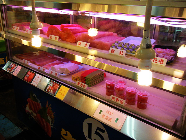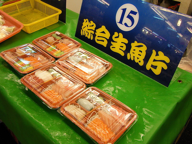 葉子爸,認為是裡面最棒的一間生魚片小販,就買一盒海鱺、紅甘、旗魚、蝦花捲回家享用~