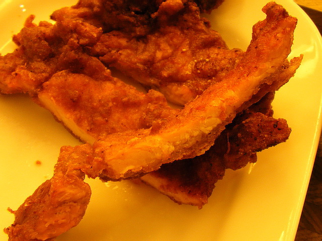 炸豬排(寬)拉麵(豬骨湯頭):湯頭微鹹而順口,不如日式拉麵那種豬骨湯來得濃郁,滴入些許辣油,和著麵條享用,味道與麵的口感,都是一碗不錯吃的湯麵!至於,炸豬排,雖不多汁,但外酥內嫩的口感,挺棒地!