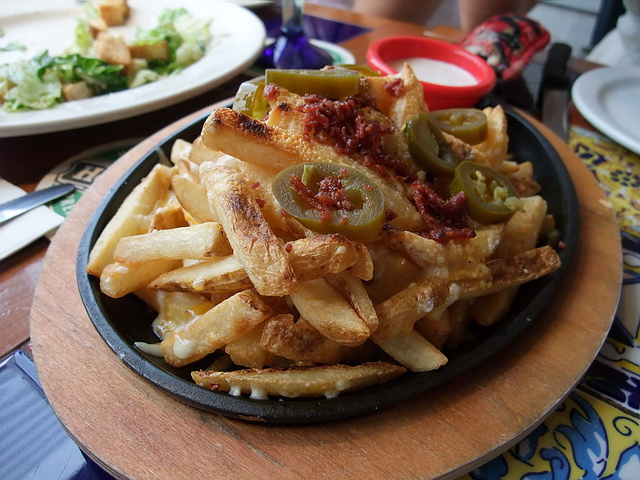 鐵板薯條:(因為不吃牛肉,所以沒有淋牛肉醬),除了薯條外,佐料有起士、培根、墨西哥辣椒等,但薯條的口味不是葉子的菜,不是很愛吃薯條的人,還是看看就好~