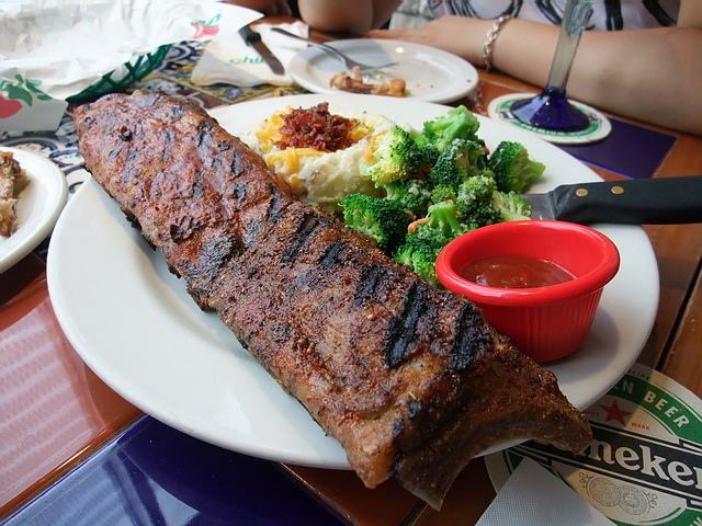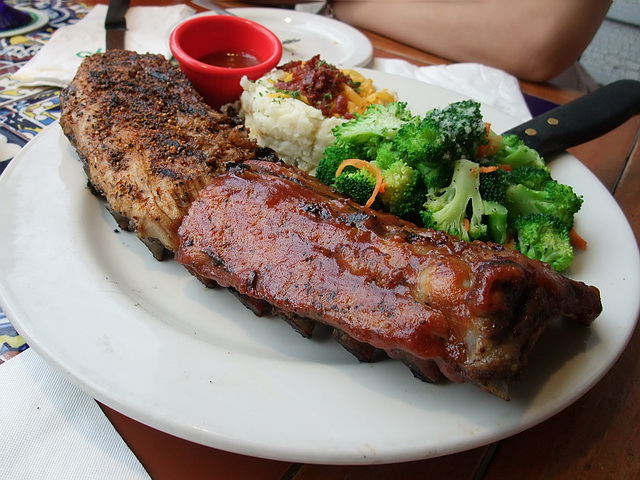 重頭戲的主角,就是這一道~碳烤豬肋排:各為「原味」「香草孟菲斯」兩種口味,盤附薯泥、花椰菜。但這兩塊豬肋的品質不好,肉太柴且無油脂的香!但轉告店員後,隨即,補上一份,且說明其目前還是無法克服這種狀況的原因......