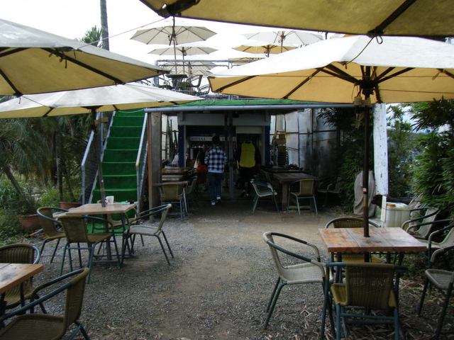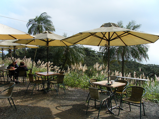 沿著邊坡設立,有一、二樓皆有座位。雖然有陽光參與,但山頂上的風,依舊冷,最後,大家選擇窩在圍欄側坐。