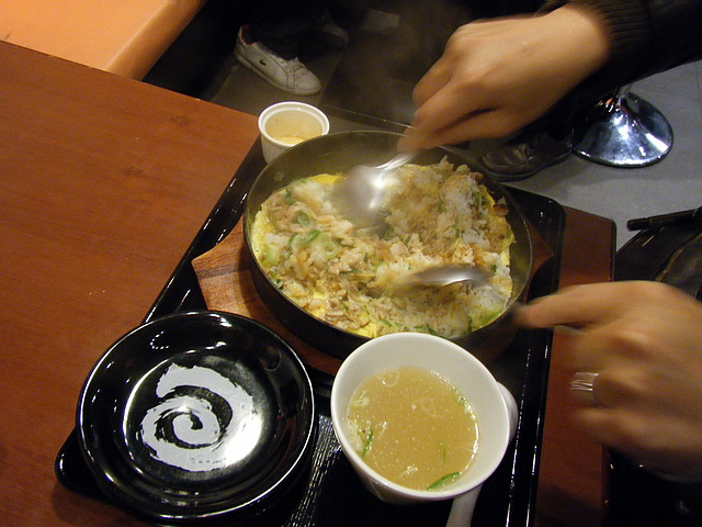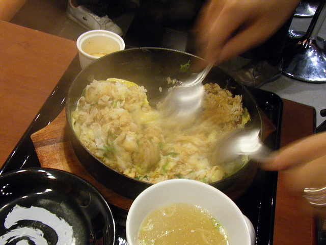 如同石鍋拌飯的感覺,要吃鍋巴就慢的炒~若不愛,就快點炒翻均勻,即可享用~