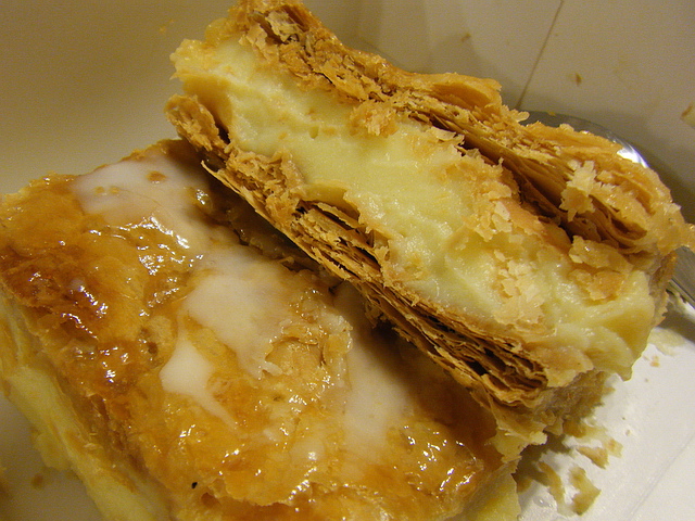 原味1001頁千層派:第一眼瞧,就想起義美冰淇淋餅乾(夏天到了咩)。上下各為兩層酥皮(白色部分是翻糖),夾著厚厚地卡式達餡,光視覺,就誘人口水!