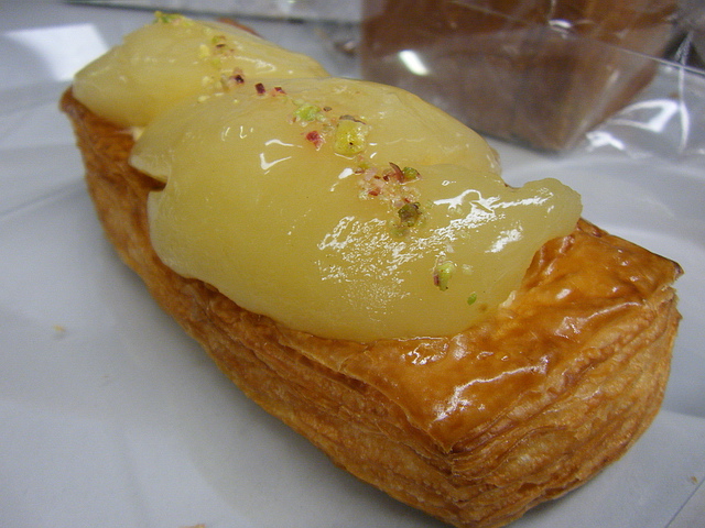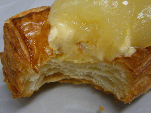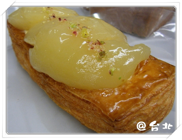 蘋果丹麥:底層為丹麥麵包,上頭為切片蘋果,兩者間融著香草卡士達。層次口味雖然有,但滋味上,葉子&魔女覺得卡士達醬比較出色,若說蘋果派類,與之前吃的PAUL相比,葉子較推PAUL的英式蘋果