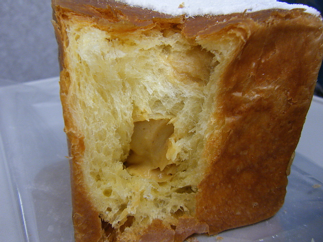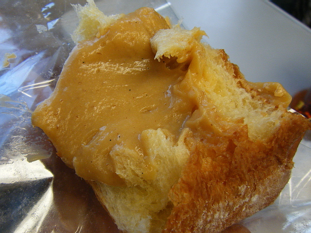 香蕉焦糖布里歐:小妹推薦的一款,她說在香港吃過,很好吃(就是掛保證啦)。光麵包體就讓葉子很愛,類似丹麥土司的感覺,裡頭軟,隨著細嚼轉化,就是一股麵包甜香;至於裡頭爆滿的香蕉cream,甜度比較重,但也讓香蕉味道式微許多,很適合葉子這種不敢吃香蕉的人!