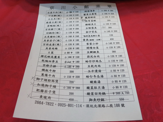 MENU(放大):扣除劃掉的菜色,其實選擇不算多,但大致上都是討喜的。價格平實(尤其上桌後的菜色份量,更讓葉子覺得如此),以中份量來看,大部分菜色價格介於200~300間