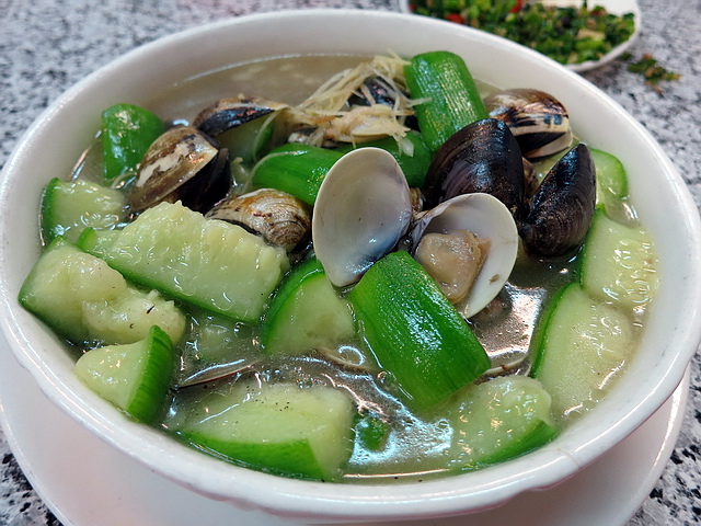 蛤仔炒絲瓜:與櫻花蝦高麗菜一樣,都是很棒的清爽且常見的菜餚,尤其絲瓜軟嫩又鮮甜,讓葉子吃得過癮!