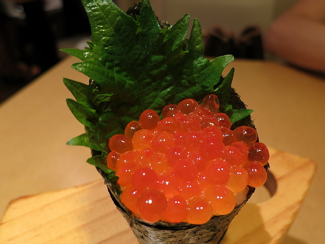 鮭魚卵手捲:滿滿的鮭魚卵,還夠意思地配了紫蘇葉,增添一股香氣。但小妹也很夠