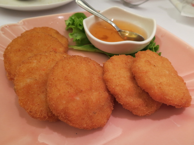 泰式魚餅:類似金錢蝦餅的新產品,但魚餅的味道有點怪,有股腥味滿著嘴,且口感偏軟無彈性,讓大家吃不太慣,也就成為這一餐墊底的一品啊