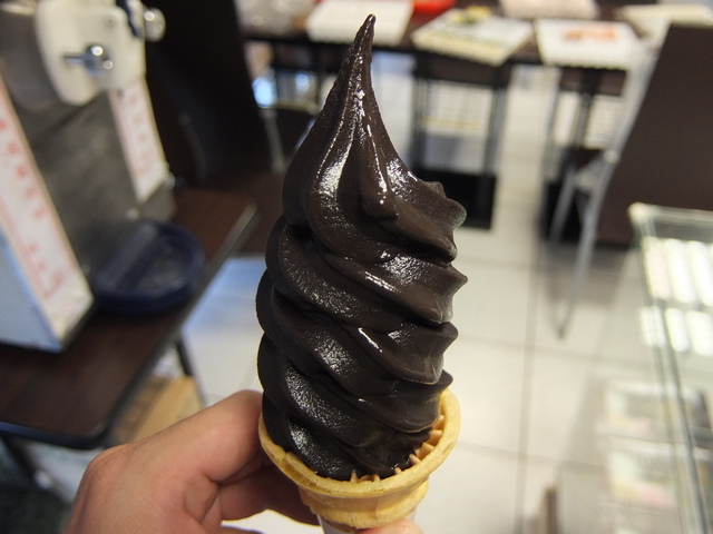 今日口味 是 黑壓壓的【巧克力】,口感微綿,類似之前新光北海道展所賣的霜淇淋口感滋味;而巧克力部分,苦味甜度適中,不是膩口的巧克力甜味~