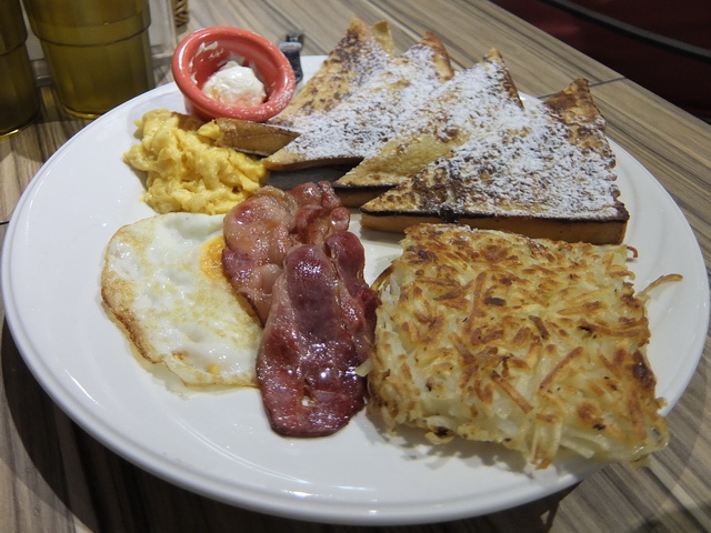 法式吐司早餐:兩片法式吐司,搭兩種蛋,外掛一種肉(可選培根、香腸、火腿),還有一大塊現煎薯餅。氣勢有出來,但口味上,就顯得普通,妹婿沒完食