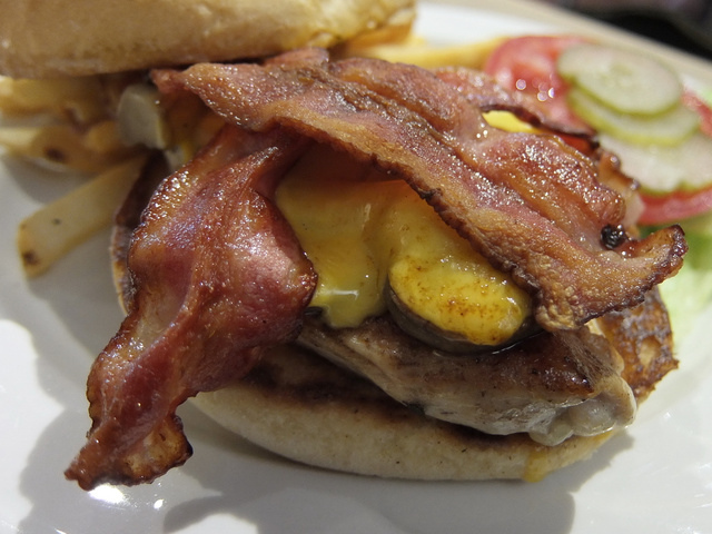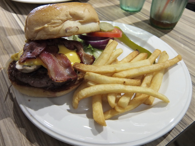 等了一會,葉子的起士培根漢堡(雞肉)也補出場!除了本身的雞肉、培根、起士外,葉子還加點蘑菇,再搭盤附的蕃茄、薯條等,一整個豐富。