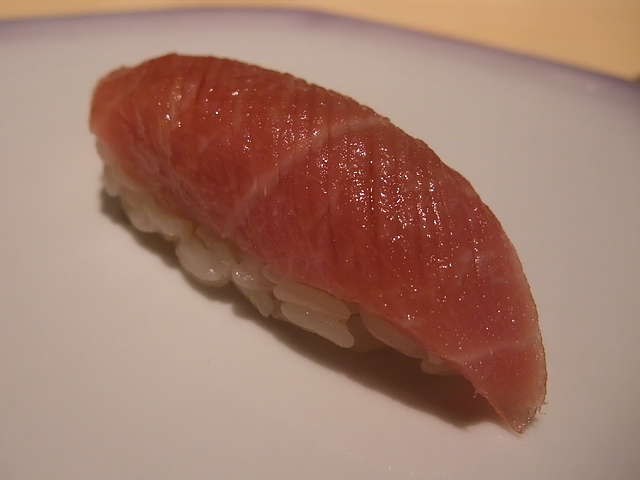 黑鮪中腹nigiri:清爽後,就上了這一品撼動大家的nigiri,雖然不似上腹肉那種油脂炸裂的暴力,兼具油脂、魚肉鮮味,還有醋飯狀況,是今天最棒的一貫!