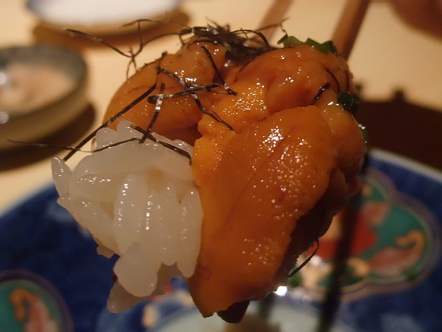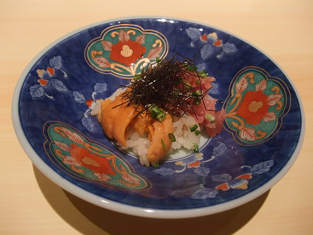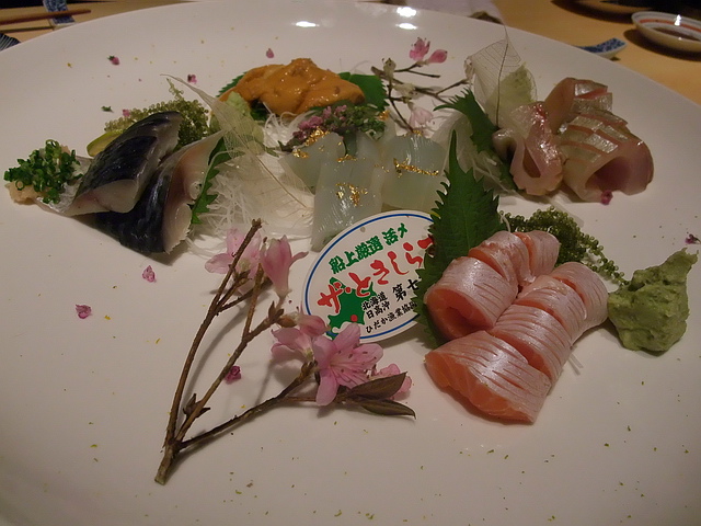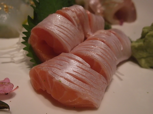 刺身盛合:有青花、海膽、島鲹、時不知鮭、墨烏賊,每一品魚生,各有風采,若要葉子選,就是墨魚賊、青花、海膽最討葉子口味。再者,初次品嚐的時不知鮭,更讓葉子嚐到不同於鮭魚油脂味道的層次,多了一份高雅細膩的香味