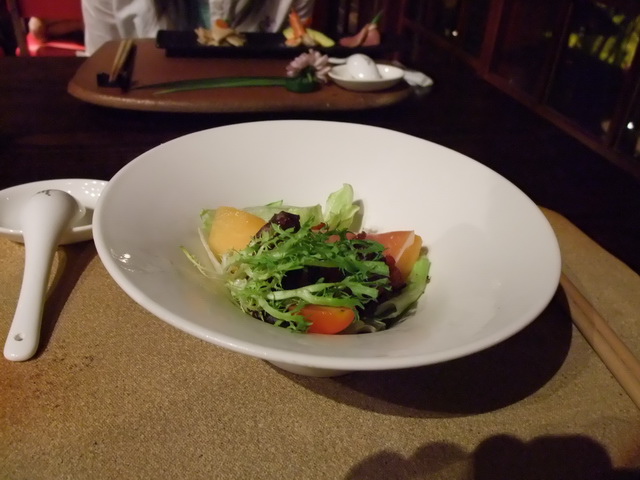帕瑪森火腿沙拉:一片肉片外,還有哈密瓜陪襯,搭著和風的醬汁,一整個怪異的味道衝突,尤其哈密瓜的甜與醬汁的酸,很怪,但不會不敢吃。