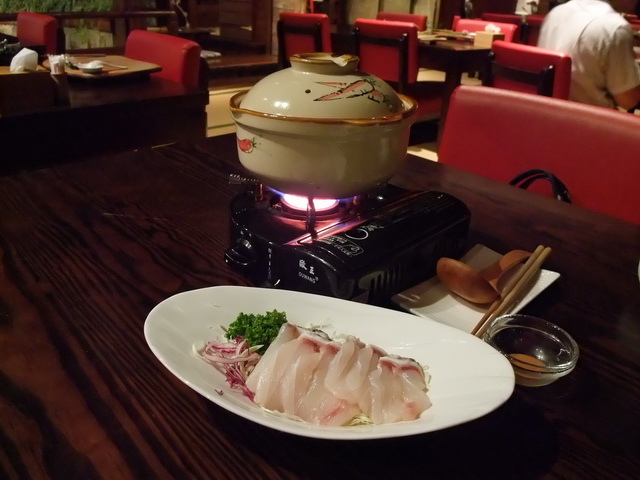 龍膽石斑魚湯:陶鍋內已有用魚骨、薑絲熬煮的湯,待湯滾後,把魚肉放進,稍微悶一分鐘後,即可關火享用。這一鍋湯,非常好喝,尤其魚肉的品質很好,算是比主菜還搶眼的一品。