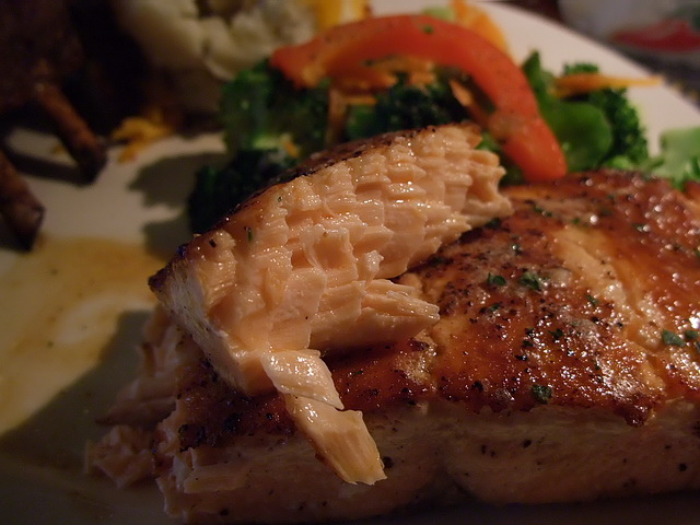 雙拼組合的誘惑,不慎選了蒜香香料鮭魚,但那念茲在茲的碳烤豬肋排,搭配魔女選擇的Memphis乾料與豬肋碳烤後得滋味,真是得人心者得天下的感受!棒極了幻想著,鮭魚可否變成另外半份的豬肋>"<...雖吃了不甚入味的鮭魚排,但盤附的馬鈴薯泥,和著碎培根、起士一起吃,身份可是位居此盤餐點的二哥地位