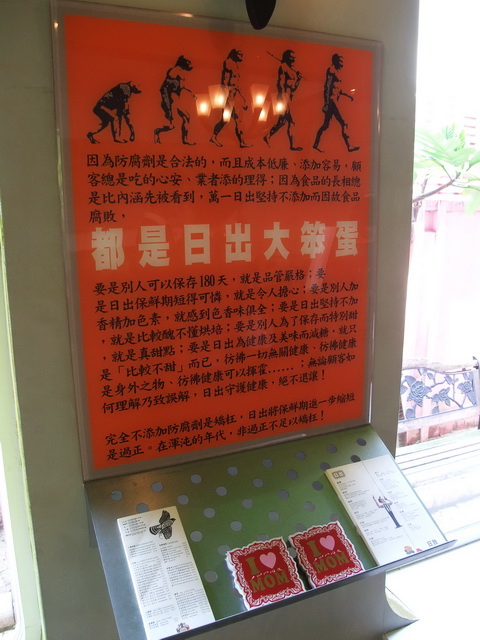 第一次認識日出,是他的乳酪蛋糕;第二次享受日出,是他的土鳳梨酥;第三次走訪日出,滿足一睹風貌的期待,就是一種愛不釋口的感覺。日出,除了大地外,另有三間分店,座落台中,各為修道院(精誠商圈)、土鳳和旅人(中港路),每間的店的特色,各有不同,但商品依舊維持其堅持的特色啊!