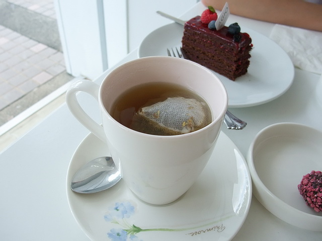 店內的溫度,沁涼著身子,稍歇思考後,選擇 Winter Forest(冬日森林巧克力蛋糕) / 熱洋甘菊 / 松露巧克力(Whiskey, Matcho, Cassis )