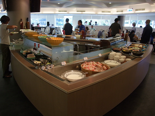 中央區域:提供日式冷食、手捲、西式冷盤、起士等,廚師面向的那一側,主要為生菜沙拉等餐點
