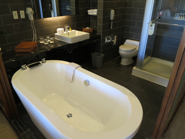 盥洗沐浴區,位於房門口處,空間約佔客房1/3,頗為寬敞,置入浴缸、衛浴、盥洗設備,也不覺擁擠!