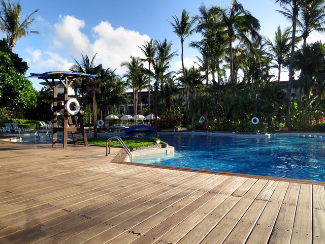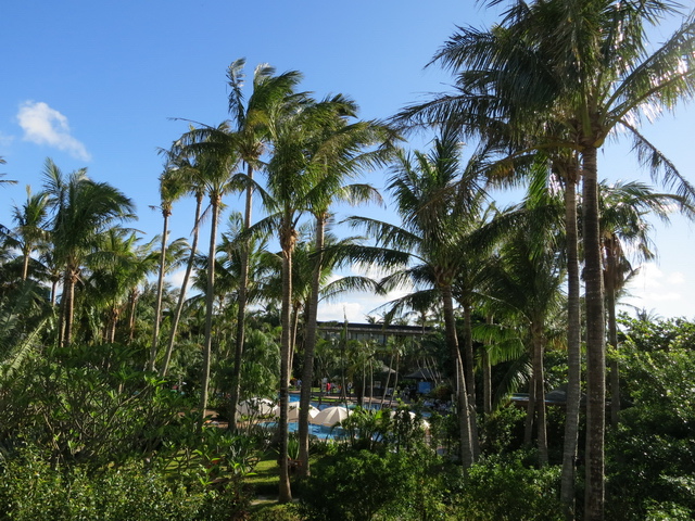 陽台望去,就是熱帶風情的景觀,不遠處,就是飯店游泳池(可惜,龍貓不會游泳),說不上什麼景觀風情,還是放下行李,往外頭的小灣沙灘吧