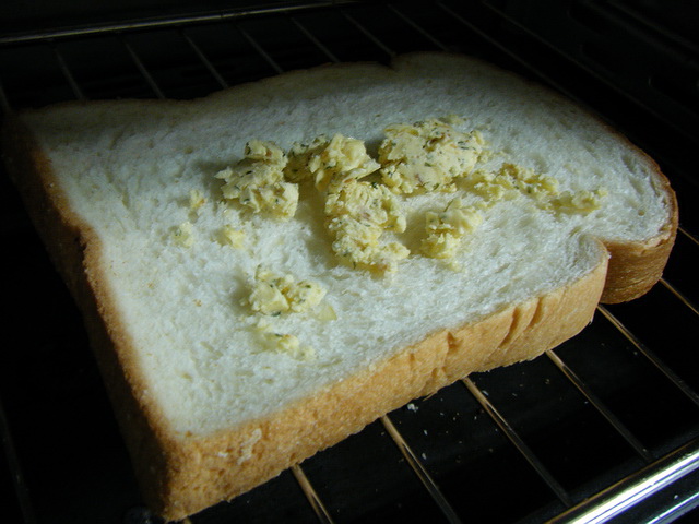 等不及化,就直接置入烤箱~葉子利用剛熱起的溫度,融化大蒜醬!這時候,趕緊抹均土司上的大蒜醬就可以啦~!至於量的多寡,看自己對口味輕重的喜好嚕~再者~烤多焦?也看自己喜歡的口感囉~