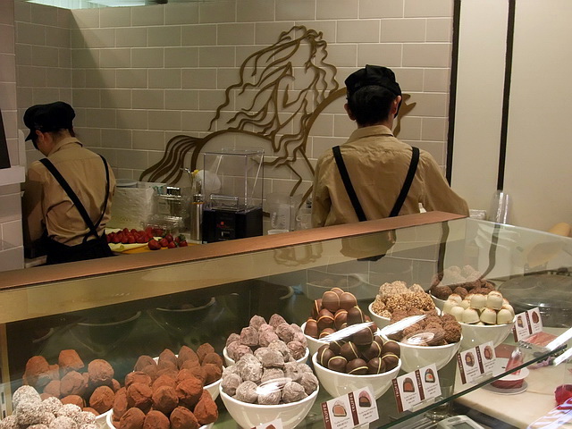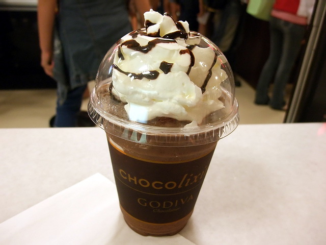 雖然葉子不太愛吃巧克力,大多都是買來送魔女品嚐居多。但這一杯巧克力飲料,一定要再次大力推薦~不然,每次都寫冰淇淋而如此冷落它的存在,還真是不公平捏!現在新光三越中山店B2,變得很有競爭性,一下手扶梯,左右各佔據著葉子&魔女都算喜歡的店:DONQ、Mister Donut、Cold Stone、Haagen-Dazs、GODIVA、Opera~還真讓人都想來上一份哩