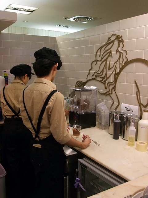 親切的店員,正在處理葉子的純黑巧克力凍飲