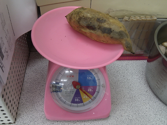 挑好想吃的蕃薯,旁有磅秤可秤重,葉子選得這一條地瓜,價格$25