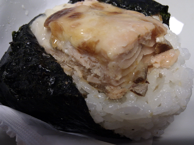 葉子:「這一款極上焗烤鮭魚,不論滋味好壞,光鮭魚片的厚度,可一改葉子對小七飯團的印象。至於好食與否,葉子覺得尚可,若討厭鮭魚鹹味的朋友,那還是先選擇另一款,可能比較合適喲(猜)