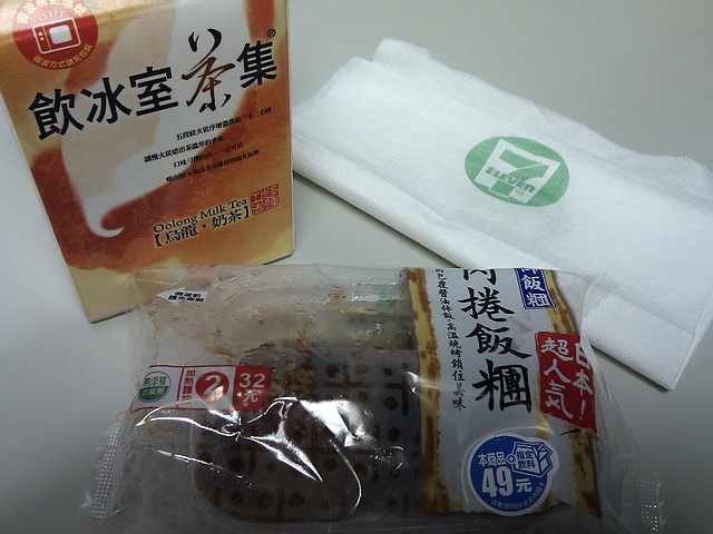 $49組合‧飲冰室茶集(烏龍奶茶) + 肉捲飯糰:飲料就不多介紹啦,就是偶而會買來喝的甜茶飲,感覺還不錯,是葉子偶買的選擇之一。