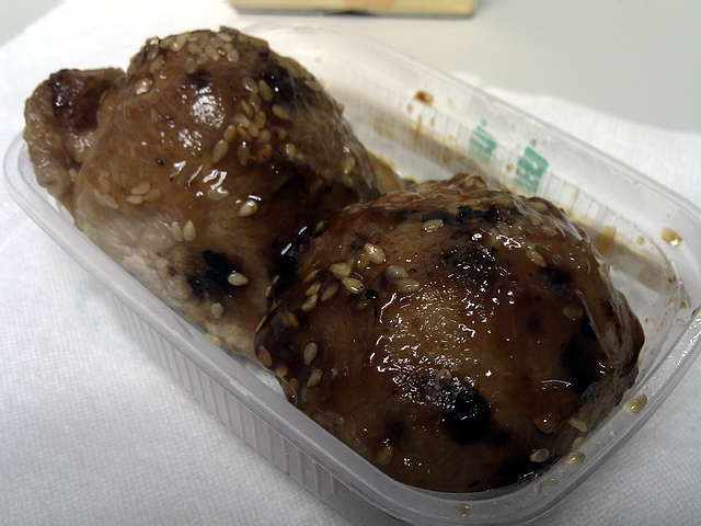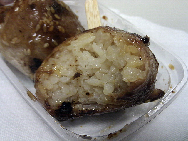 兩個肉包著飯的飯團粒,份量不多,但卻是值得讓葉子想再吃的滋味!重點是肉片,那滲入味的醬香味道,雖有點鹹,但混著飯後,也稍微平衡了些。整體而言,是一種不同口味變換的選擇啊!尤其打開時,那漫著烤肉氣味空間,還讓人誤以為在烤肉哩