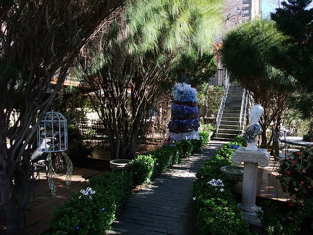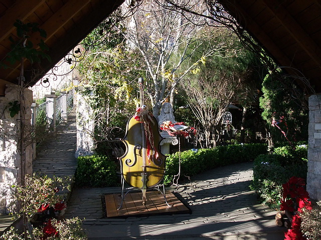 停好車後,大門迎接著就是一把大提琴~而其庭院造景,感染著悠閒~
