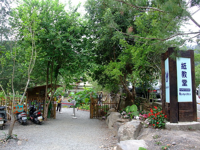 路經暨南大學後,不遠處,就可看到桃米生態村‧紙教堂的標示。進入前有一大外停車空地,可免費停車。