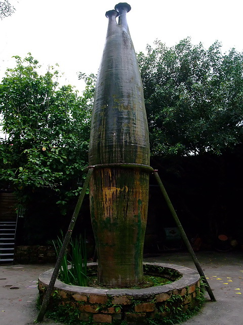 蛇窯結構:前端為火膛(燃燒室),延伸至後為窯室,後端為煙囪;而窯室兩旁則為護窯牆,中間部分有一窯門,後端有一窯尾門。